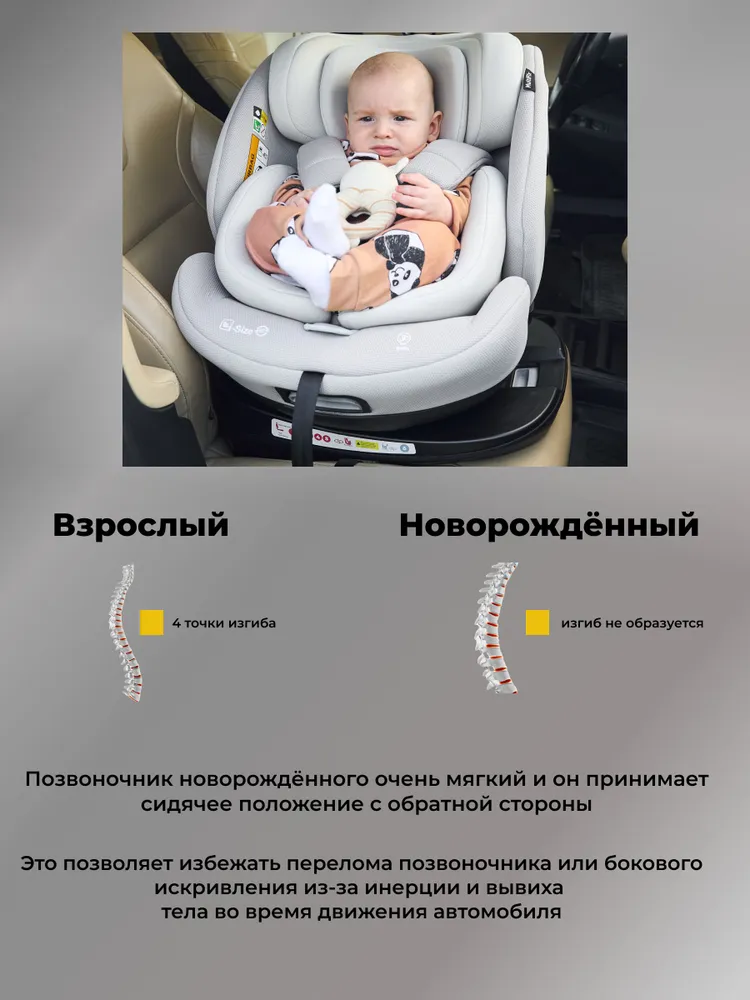 Удобная посадка с поворотом на 360 Поворотный механизм упрощает посадку и высадку ребенка, экономит время родителей и помогает правильно натянуть внутренние ремни безопасности. Пятиточечная система удержания распределяет нагрузку и надежно фиксирует малыша в кресле.