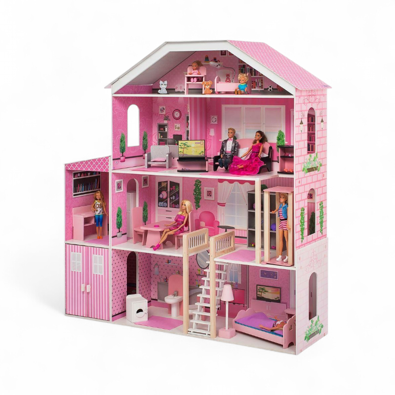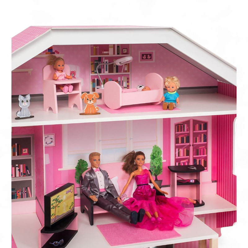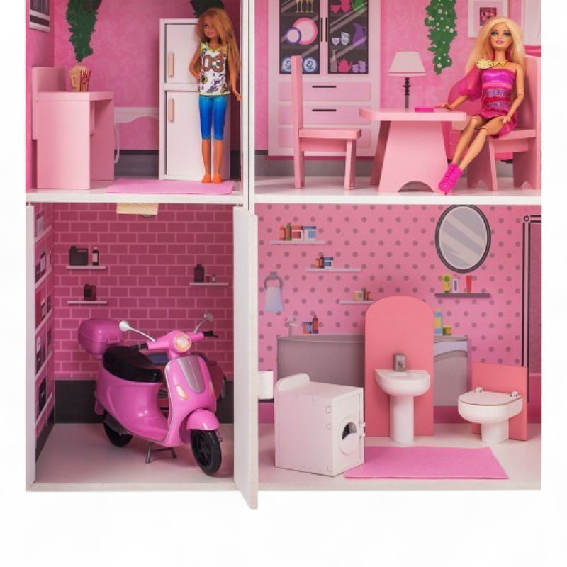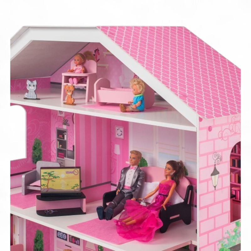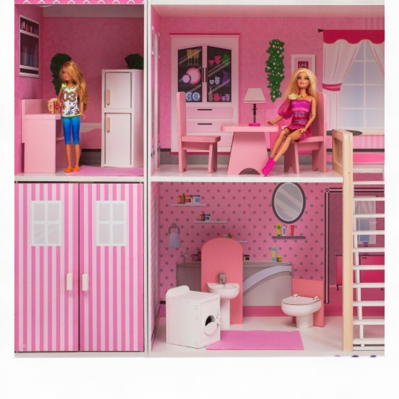 Надёжные материалы и аккуратная отделка: корпус и мебель выполнены из дерева и МДФ с приятной на ощупь текстурой, элементы тщательно отшлифованы. Дом оформлен в девичьем стиле с нежными розовыми оттенками и пастельными принтами — интерьер сразу «играбелен», не требует наклеек или раскрасок. Отсутствие световых/звуковых эффектов и питания делает конструкцию безопасной и не требующей батареек, а прочность деревянной основы обеспечивает долговечность даже при активной игре.