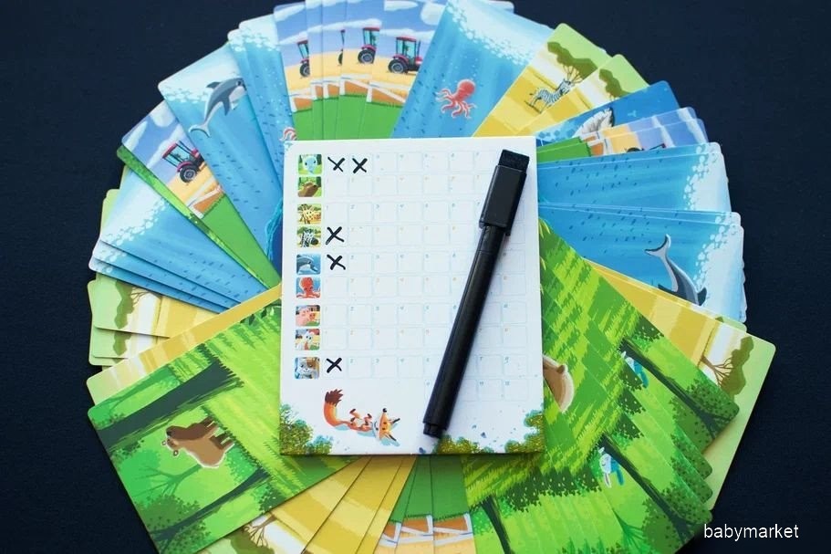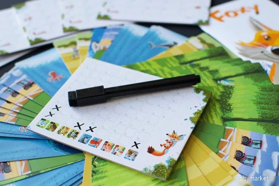 | Комплектация | 48 карт четырёх разных сред обитания (сельская местность, саванна, море и лес), 1 карта лиса, 1 карта с комиксом (не используется в игре), 5 стираемых маркеров, 1 ламинированный планшет для подсчёта животных/памятка, 5 ламинированных планшетов, буклет правил |
