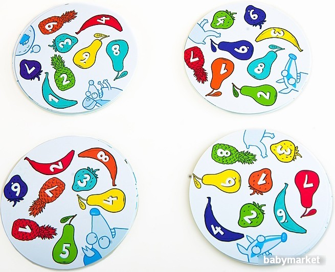 | Информация | Найденные числа должны совпадать либо по цвету (например, синий), либо по виду фрукта (например, ананас). Получается увлекательное соревнование в математической зоркости и арифметической скорости. Игрокам, подбирая варианты, нужно выполнять десятки действий с числами в минуту! |