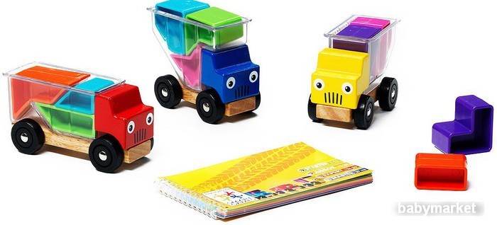 | Информация | Самый первый в жизни собственный грузовой автопарк. Кавалькада глазастых грузовичков отправляется в дальнее путешествие. Но как загрузить в прозрачный кузов все эти разноцветные детали причудливых форм, чтобы не осталось пустого места? Вот это задачка для юного автомобилиста! Малыши смогут просто играть с грузовичками, складывая и выкладывая детали-формочки, а дети постарше научатся выполнять задания этой головоломки, компактно заполняя кузова грузовичков. И очень может быть, что выполняя увлекательные задания по карточкам, Ваши юные «грузоперевозчики», даже не догадаются, что не просто играли, но решали сложные инженерные и логистические задачи. Над заданиями уровня "мастер" интересно поломать голову не только малышам, но и школьникам. |