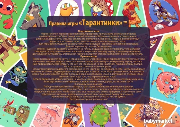 | Информация | Игроки рассаживаются по кругу, и игра начинается. Очередной игрок переворачивает песочные часы и начинает задавать вопросы всем остальным игрокам или какому-то конкретному игроку, пытаясь идентифицировать себя (угадать, кто или что изображено на его карточке). Игроки обязаны быстро, четко и правдиво отвечать на его вопросы.Если игроку удается угадать, что изображено на его карточке, он забирает ее себе. Затем он выбирает и крепит на голове следующую карточку из лежащих в центре стола. Игра продолжается, пока сыпется песок. Ход заканчивается вместе с песком в верхней половинке часов. Следующий по очереди игрок начинает свой ход с того, что переворачивает часы.Если за время хода угадать карточку не удалось, игрок продолжает попытки в следующие свои ходы. Если карта никак не отгадывается, можно менять ее на другую, но не очень часто. К примеру, раз в два хода.Победителем признается тот игрок, кто собрал наибольшее количество карточек.Наша игра предназначена для детей от 7 лет. Но в нее могут играть и дети более старшего возраста, подростки или взрослые. Чтобы игра стала еще интереснее, можно придумать и нарисовать свои собственные карточки, вырезав их из картона или стандартной бумаги для записей. Или можно просто написать заготовленные слова на листах бумаги. |