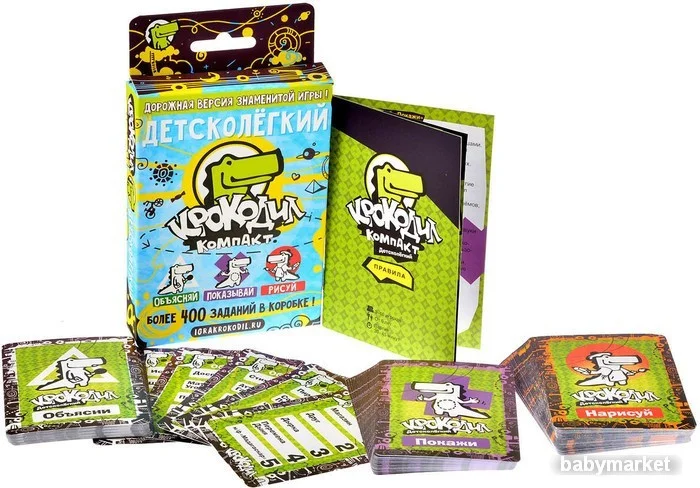 | Информация | Это специальное детское издание крокодила в маленькой дорожной коробке. В отличие от других изданий, слова, которые нужно объяснять, здесь намного проще, чтобы самые маленькие могли играть вместе со взрослыми.— Объясняется за 30 секунд.— Весёлая, шумная и общительная.— Для любой компании.— И видео лучше записать! |