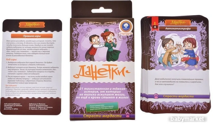 | Информация | Данетки — это загадочные истории. Сначала вы знаете совсем немного. Муж соврал жене, что на заднем дворе закопано оружие. В городе внезапно пропала вся соль из магазинов. Моряка арестовали за мошенничество, хотя его средство от морской болезни правда помогало! Чтобы понять, что произошло и почему, вам нужно задавать правильные вопросы ведущему. А он может отвечать только «да» или «нет». За пару-тройку данеток вы почувствуете себя настоящим детективом, который на ходу распутывает сложные головоломки!Это новое издание:Внутри 21 данетка — лучшие и сбалансированные детективные истории из предыдущих изданий.Другие правила — надо разгадать данетку как можно скорее, чтобы получить больше очков. При этом подсказки от ведущего отнимают очки. Игра получается быстрее, напряжённее и круто разминает мозги.А вообще Данетки — хитРазвивают логическое мышление.Можно играть где угодно. Запомнили несколько историй — и вот у вас классная интеллектуальная игра в дорогу или на встречу с друзьями.Интересно и детям, и взрослым. Тут все играют наравне и побеждают за счёт своих стараний, а не удачи. |