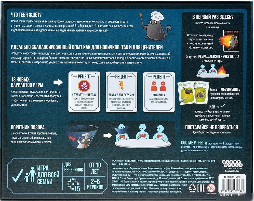 | Информация | Берём сначала укропу. Так, стоп... Это не тот рецепт! Щепотка "нападай", столовая ложка "обезвредь", четверть чайной ложки "подлижись" и полкило взрывных пушистиков! Идеально! Почувствуйте себя истинным шефом безумной кухни, приготовив к игре самую сумасшедшую смесь карт из разных версий "Взрывных котят"! Об игре Да-да, вы всё правильно поняли: "Взрывные котята: Рецепты котострофы" включает в себя 121 карту из других версий игры и дополнений (даже из тех, что ранее не издавались на русском языке)! Прекрасно сбалансированный микс для опытных новичков и начинающих мастеров. Или наоборот. Но главная изюминка "Рецептов котострофы" сокрыта в самих картах рецептов, которые предлагают целых 13 новых вариантов игры! Каждый рецепт обладает уникальными нотками, которые обязательно захочется распробовать. Только чур карты не жевать! А ещё в комплекте вас ждёт ЛЕГЕНДАРНЫЙ ВОРОТНИК ПОЗОРА, который замотивирует ваших друзей внимательнее следить за игрой и не забывать, чей сейчас ход. Это самостоятельная игра, но никто и ничто не в силах запретить вам объединить её с любой частью или дополнением серии "Взрывные котята". |