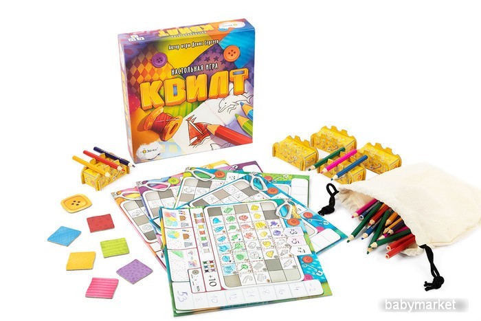 | Комплектация | - 24 карандаша (4 набора по 6 карандашей разных цветов) - 6 жетонов «Лоскуток» - 5 блокнотов с игровыми полями - 5 подставок-игольниц для карандашей - мешочек для карандашей - жетон первого игрока «Пуговица» |