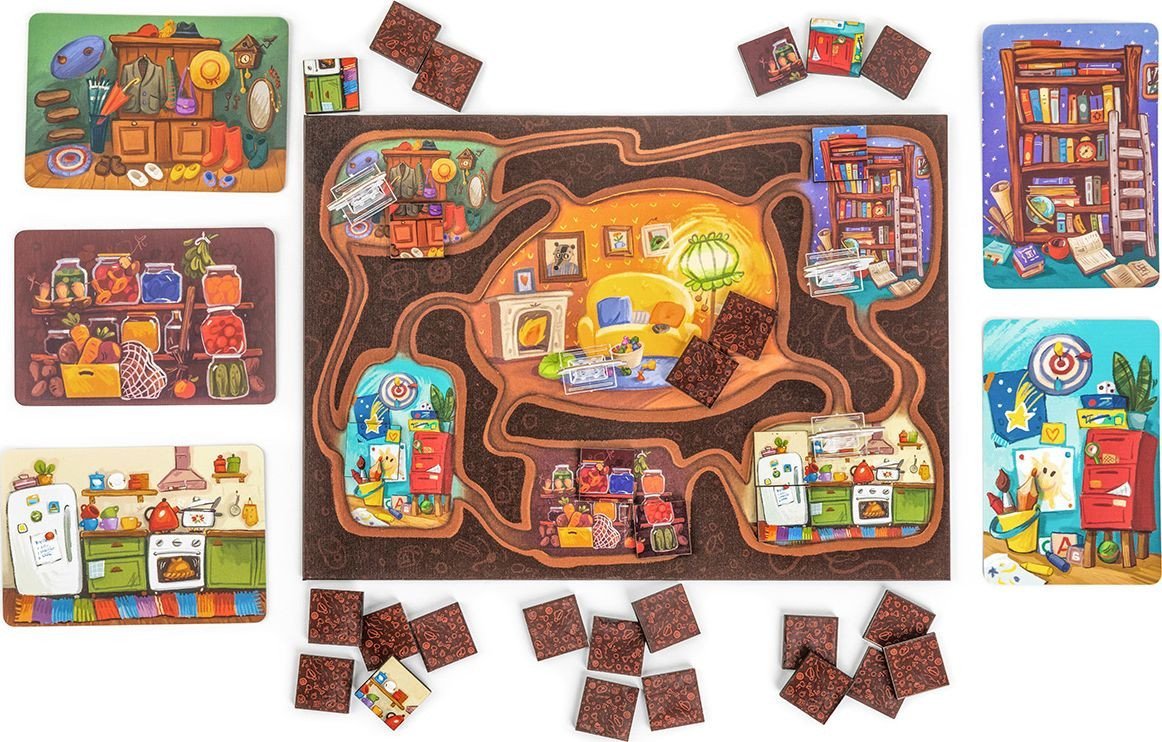 | Комплектация | игровое поле, 30 деревянных фишек комнат, 5 карт целей, 4 фигурки барсуков, 4 пластиковые подставки, правила игры |