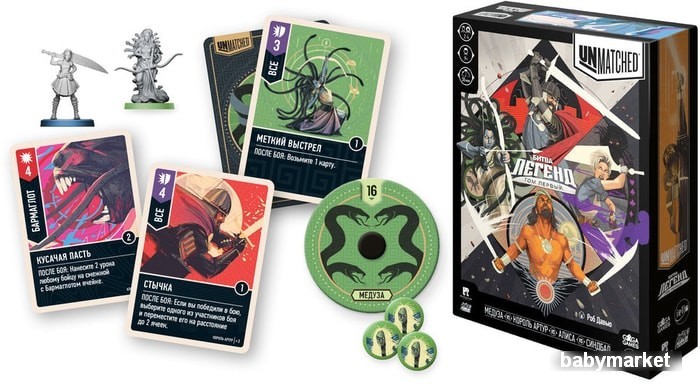 | Информация | Unmatched - горячая новинка, получившая крайне положительные отзывы критиков и обладающая внушительной оценкой на BoardGameGeek. Это асимметричный файтинг, который заставит самых разных героев сойтись в смертельной схватке, а вас - направить их к победе.В Битве Легенд вы найдете самых разных персонажей: короля Артура и его помощника Мерлина, Медузу и ее гарпий, Синдбада-морехода с верным носильщиком и даже повзрослевшую Алису из произведения Льюиса Кэрролла, вдохновленную своим прототипом из American McGee's Alice. Помимо стандартного режима на двоих, Битва Легенд позволит вам устроить поединок с участием 3 или 4 игроков.Главная цель игры - остаться в живых и не позволить сделать того же соперникам. В битве легенд подобного масштаба иной исход просто невозможен.В свой ход игроки могут выполнить 2 действия из 3 возможных:добрать карту и переместить своих бойцов;сыграть карту интриги;атаковать.Но все не так просто, как кажется. Игра асимметрична - все персонажи обладают уникальными способностями, а значит, к каждому нужно искать особый подход. Алиса постоянно будет менять свой размер, чтобы становится лучше в атаке или защите. Стая гарпий Медузы окружает жертву, чтобы использовать всю разрушительную силу смертельного взгляда горгоны. Король Артур полагается на свою невероятную силу в ближнем бою и мудрость Мерлина, который помогает постоянным добором карт. Для победы важно знать не только своего персонажа, но и слабые и сильные стороны противника. Например, Синдбада гораздо сложнее победить, если игра затянется, а убив Мерлина, вы сделаете Артура куда более беспомощным, чем раньше. |