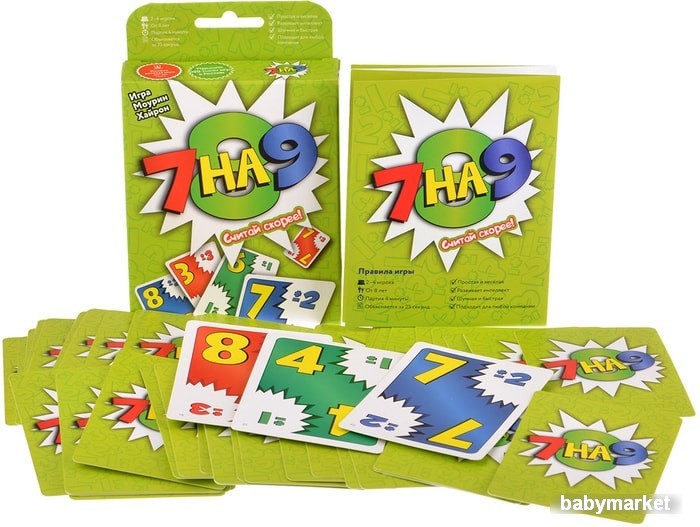 | Информация | 7 на 9 — быстрая игра на сложение и вычитание. Играть очень просто: нужно быстро считать и класть подходящую карту. Очерёдности хода нет, все действуют одновременно. Кто первый избавится от карт, побеждает. |