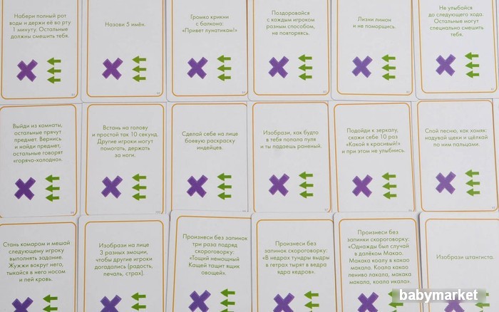 | Комплектация | — Поле для игры, по которому вы будете идти к финишу.— 100 карточек с необычными заданиями.— 6 фишек игроков.— Шестигранный кубик.— Правила |