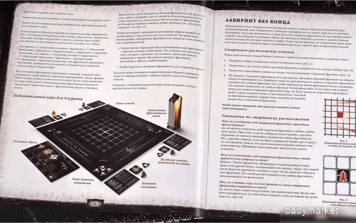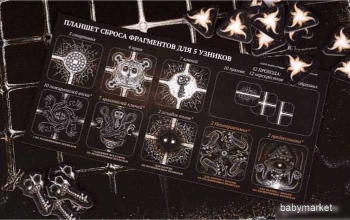 | Комплектация | 120 фрагментов лабиринта. Свеча-органайзер. 5 жетонов ключей. 5 фишек узников. 14 жетонов решимости. Двустороннее игровое поле. Жетон 4-го узника. 5 планшетов состояний. Планшет сброса. Правила игры. |