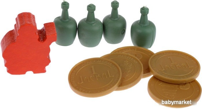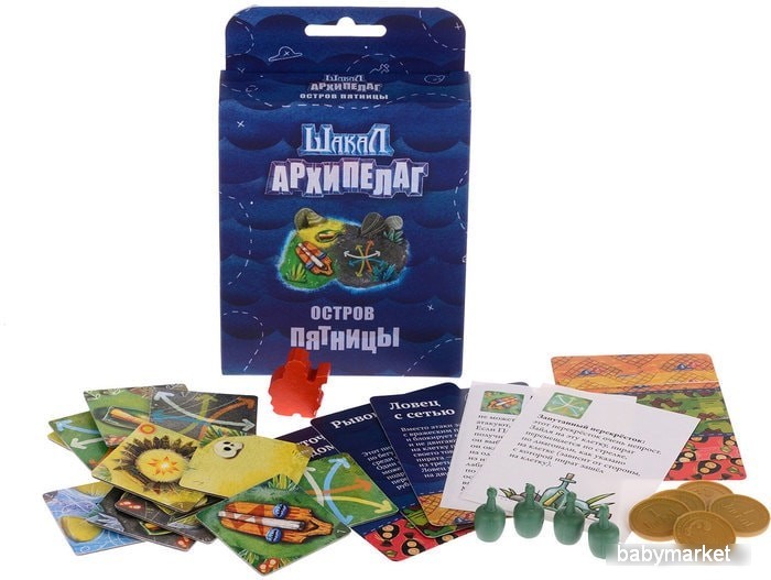 | Комплектация | 11 новых клеток острова, 4 монеты, 4 фишки бутылок с посланием, новый персонаж — Пятница и его фигурка, 3 новых карты пиратских способностей и наклейки в буклет правил Архипелага, расширяющая возможности игры |