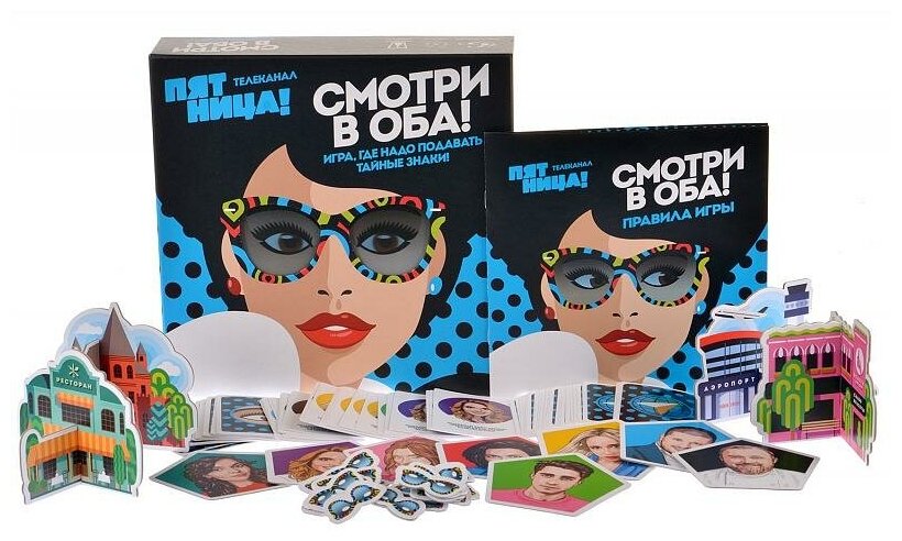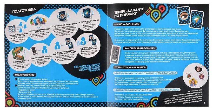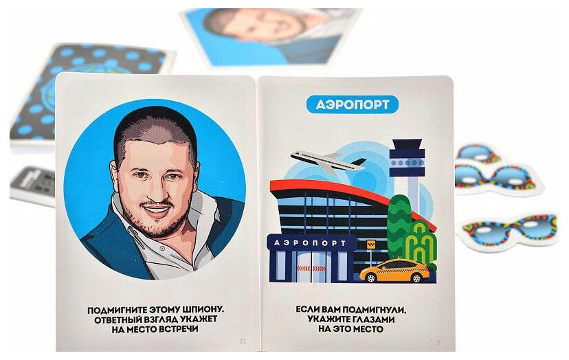 | Комплектация | 8 фишек шпионов. Вы за них играете.56 карт целей. Нужно незаметно подмигнуть вашей цели.2 карты с местами. Так ваша цель узнает, где пройдёт передача посылки.4 сборных места встречи. Ваша цель укажет на одно из них взглядом.1 фишка пульта. Показывает, кто сейчас ходит и может передать посылку.24 жетона перехвата. Перехватите взгляды шпиона и его цели, чтобы получить очки. |