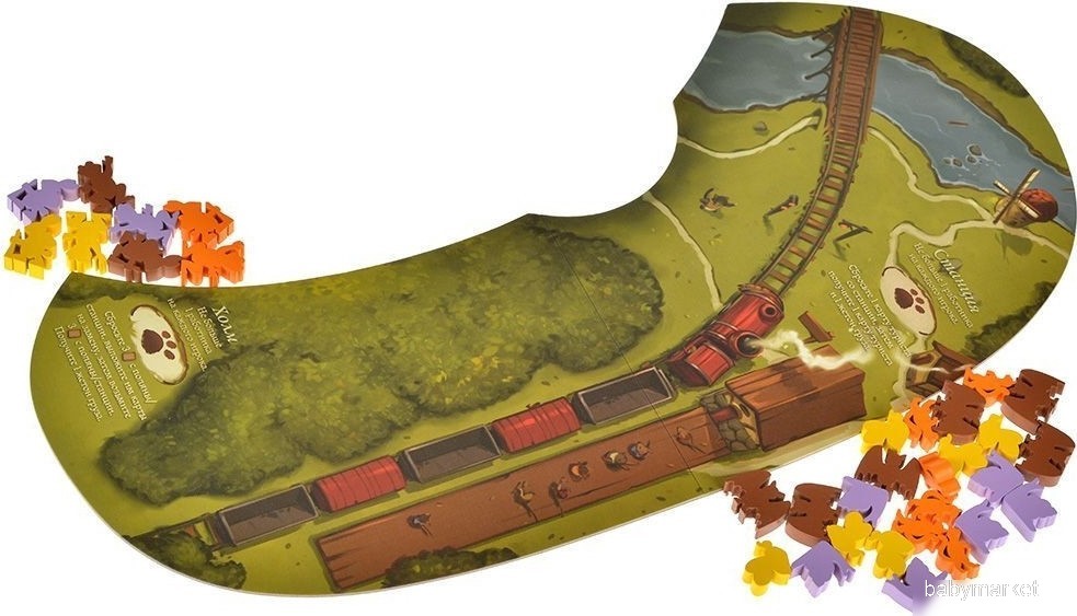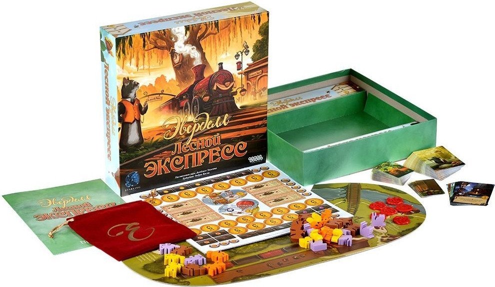 | Комплектация | Игровое поле 107 карт с красочными иллюстрациями 2 жетона основных событий 18 золотых жетонов закрытых дверей 20 жетонов победных очков 6 жетонов билетов 18 жетонов грузов 24 фишки работников 4 фишки послов-лягушек 4 фишки зайцев-исследователей 6 фишек запасов Тканевый мешочек Правила дополнения |