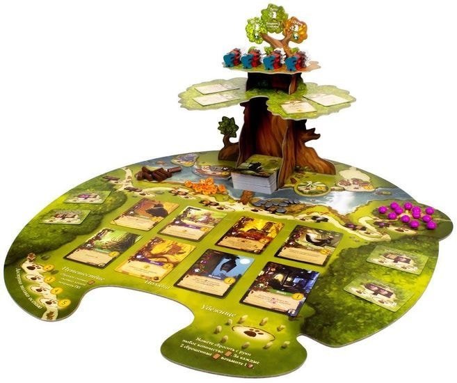 | Комплектация | Восьмигранный кубик Игровое поле Вечное древо 128 карт с красочными иллюстрациями 105 фишек ресурсов: ягод, веток, смолы и камушков 24 фишки работников 4 жетона событий 27 мини-карт 30 жетонов победных очков 20 жетонов закрытых дверей |