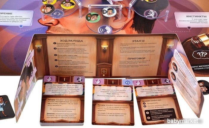 | Комплектация | - Игровое поле - 5 пластиковых платформ - 89 карт - 100 жетонов - Платформа разума - 5 памяток - Ширма прокурора - Правила игры |