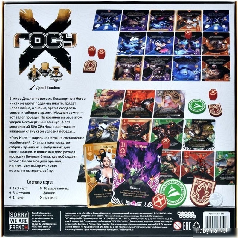 | Информация | "Госу Икс" – это карточная стратегическая игра для двух игроков. Вы возглавите альянс трёх выбранных вами кланов и сразитесь с соперником, составляя различные выигрышные комбинации карт. Всего в этом мире обитает восемь великих и могущественных существ, каждое из которых обладает своими особенностями и механиками. В порядке очереди игроки выбирают кланы. Каждый клан состоит из 15 карт: солдаты, герои и бессмертные. Все карты обладают своими личными свойствами: силой, эффектами и возможностью активации. Как играть? Каждый участник формирует свою неповторимую колоду, выбирая по три клана из восьми. Игрокам стоит обратить внимание на возможности и эффекты каждого, они отличаются не только дизайном, но и комбинациями, сбросом, комбо и прочим. А невыбранные кланы влияют на общие правила игры в ближайшей партии, добавляя неожиданные повороты событий в ходе партии. Затем каждый игрок перемешивает свои выбранные колоды, создавая одну большую личную колоду из 45 карт. Из неё он берёт семь карт на руку – битва начинается! В свой ход игрок может выполнить одно из следующих действий: Разыграть карту Чтобы собрать армию, игрок выкладывает карты с руки перед собой. Начать сбор армии можно только с карты первого уровня – солдата. Как только карта оказалась на столе её текстовый эффект и свойства срабатывают Заменить карту Если на карте есть стоимость замены, то её можно заменить на карту того же уровня с руки, причём клан может быть абсолютно любым. Для замены игроку нужно сбросить с руки количество карт равное стоимости замены. Эффекты новой карты тут же срабатывают Потратить 1-2 фишки С помощью фишек активации игрок может добрать карты из колоды. Потратив одну – возьмите одну карточку, потратив сразу две – возьмите целых три! Если же вы хотите получить ещё пару фишек активации, то обратитесь к великому Бён Хён Чжа. Помимо добора фишкой вы можете активировать эффект карт, с символом активации! На каждой его карте написаны условия при которой фишки разблокируются Спасовать Пасовать можно только если у вас не осталось фишек активации. Игроки ходят по очереди до первого паса одного из игроков. После этого его соперник может сделать до трёх ходов. Кто победил? Великая битва начинается. С каждой секундой напряжение растёт, и армии готовятся к решающему столкновению. В этом сражении всё решается через сравнение суммарной боевой силы каждой армии. Лишь тот, чья сила окажется наивысшей, получает заветную фишку превосходства. Все взоры устремлены на поле боя, ведь первый, кто соберёт две фишки превосходства, станет победителем в этой эпической схватке. Но что если силы равны? В этом случае побеждает тот, кто владеет фишкой чуда! |
