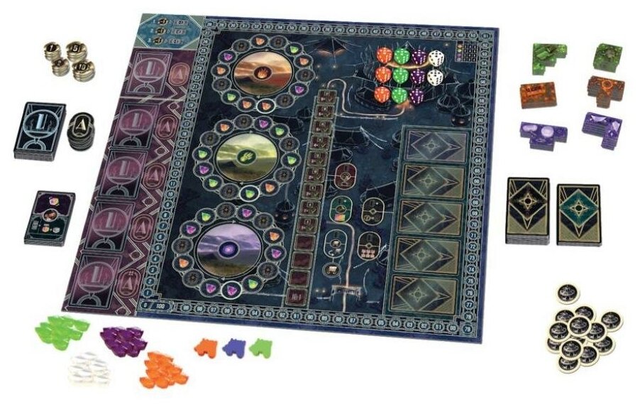 | Комплектация | - Игровое поле- 4 планшета игроков- 110 карт- 68 жетонов- 84 фрагмента лагеря- 19 кубиков- 48 самоцветов- 47 деревянных фишек- Правила игры |