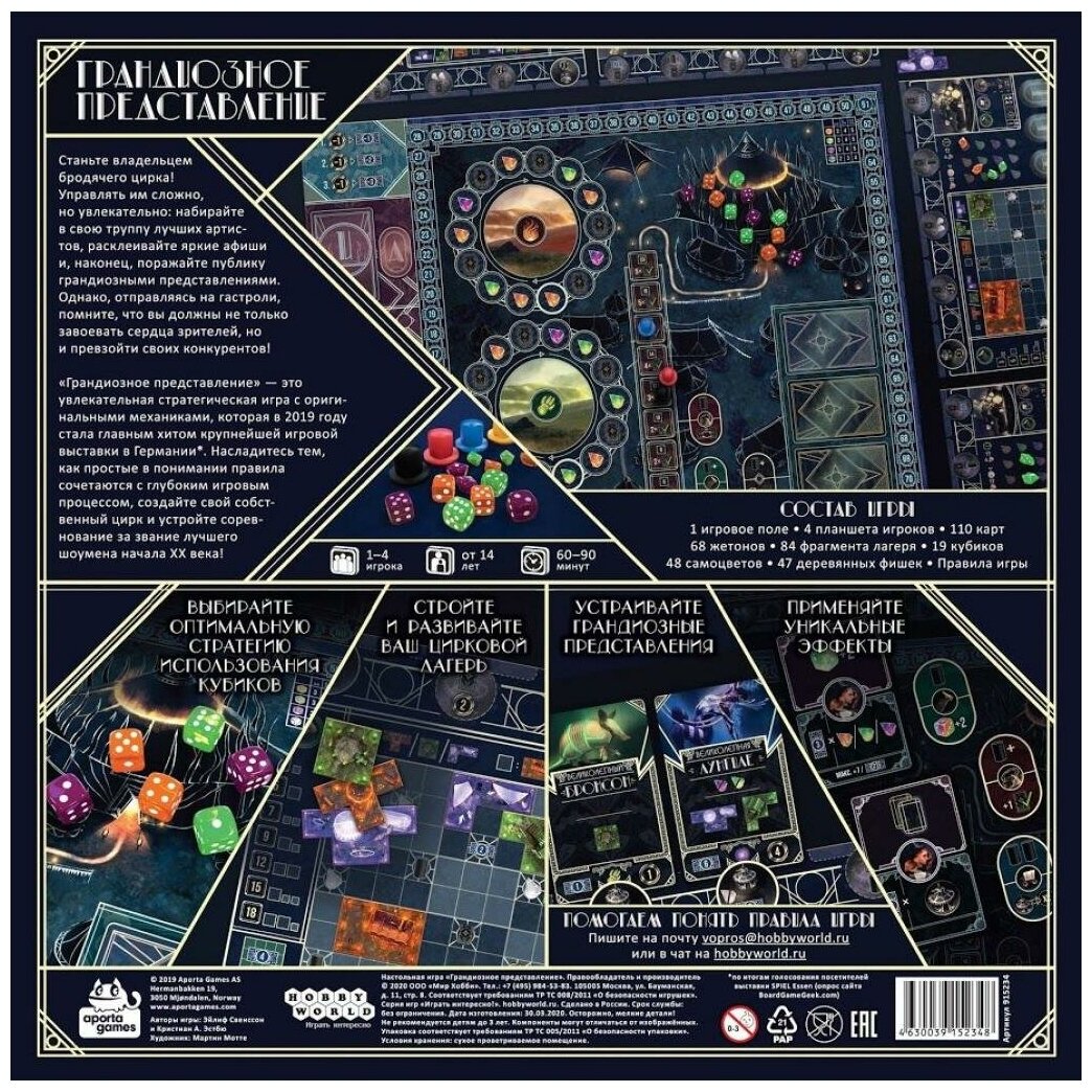 | Информация | Станьте владельцем бродячего цирка!Управлять им сложно, но увлекательно: набирайте в свою труппу лучших артистов, расклеивайте яркие афиши и, наконец, поражайте публику грандиозными представлениями. Однако, отправляясь на гастроли, помните, что вы должны не только завоевать сердца зрителей, но и превзойти своих конкурентов!"Грандиозное представление" – это увлекательная стратегическая игра с оригинальными механиками, которая в 2019 году стала главным хитом крупнейшей игровой выставки в Германии (по итогам голосования посетителей выставки SPIEL Essen, опрос сайта BoardGameGeek.com). Насладитесь тем, как простые в понимании правила сочетаются с глубоким игровым процессом, создайте свой собственный цирк и устройте соревнование за звание лучшего шоумена начала XX века! |