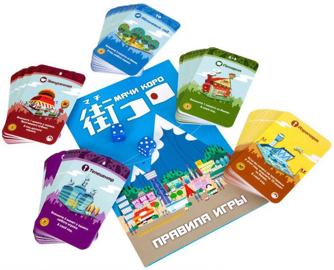 | Информация | Настольная игра «Мачи Коро» — игра для 2-5 игроков, которые хотят окунуться в уютную Японию. Вы берёте на себя роль мэра маленького, но амбициозного городка. Как мэр, который любит свой город, вы хотите его процветания и развития. Стройте закусочные и аэропорты, украшайте улочки садами и достопримечательностями, а результат не заставит себя долго ждать. Но не забывайте, что близлежащие городки тоже не стоят на месте, и вам предстоит вступить в нешуточную борьбу за право провозгласить свой город лучшим! |