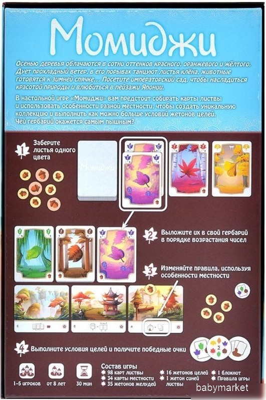 | Информация | В последние солнечные месяцы года деревья преображаются под рукой настоящей художницы, природы. Холодный ветер ласкает ветви деревьев, играя с падающими листьями, которые, словно огоньки – красные, оранжевые и золотистые – освещают путь. Путешествие по Императорскому саду обещает быть незабываемым. Здесь вы забудете о повседневных заботах и окунётесь в океан красок и ароматов и удивительных осенних чудес. Momiji приглашает вас исполнить различные задания, собирая самые ценные листья в этом древнем саду Японии. Об игре Ваша задача – собрать неповторимую коллекцию осенних листьев в гербарий и выполнить условия жетонов целей. В настолке предусмотрено несколько режимов игры, чтобы каждый нашёл что-то по своему вкусу. Для уже опытных игроков можно предложить сыграть с расширенными правилами игры, а если вы хотите проникнуться атмосферой осенней меланхолии в одиночестве, то у “Момиджи” есть одиночный режим с тремя уровнями сложности. |