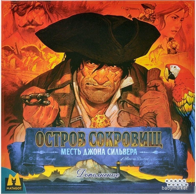 | Информация | - "Мир Хобби Остров сокровищ: Месть Джона Сильвера" - дополнение к популярной настольной игре "Остров сокровищ: Тайна Джона Сильвера". Включает 2 новых модуля: "Новые острова" и "Уловки Джона Сильвера". Модуль "Новые острова" добавляет 2 новые карты и 11 новых подсказок. Модуль "Уловки Джона Сильвера" позволяет настроить уровень сложности для пирата. Требуется базовая версия игры. - |
