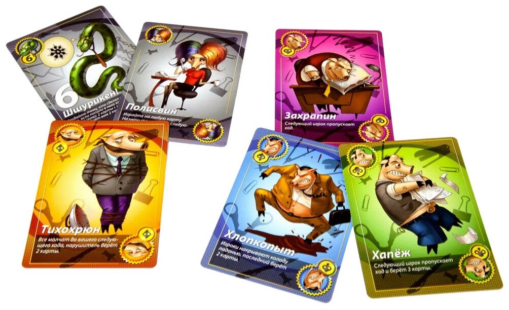 | Комплектация | - 64 цифровые карты;- 36 карт свинской бюрократии;- 12 карт змеиной чопорности;- 2 змеи для креативных;- подробные правила. |