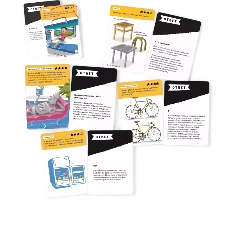 Развивает техническое мышление на жизненных примерах. Ребёнок учится понимать, как устроены предметы и механизмы, как объекты влияют друг на друга, и искать изобретательные, эффективные решения задач. В наборе 80 уникальных заданий с ответами, которые постепенно усложняются и формируют уверенность в собственных инженерных находках.