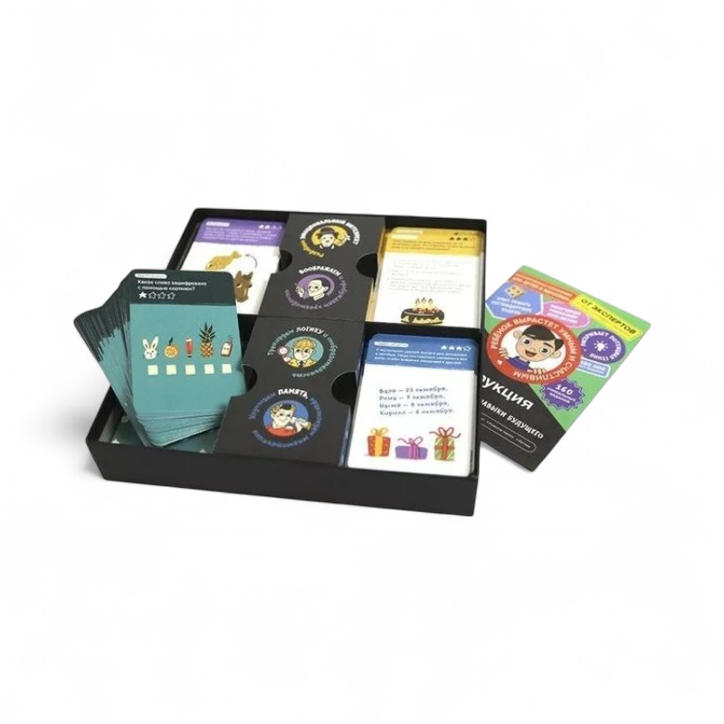 Для старта в мире soft skills — внутри собраны 160 карточек с заданиями на логику, память, воображение и эмоциональный интеллект. Форматы «индивидуальный тренинг» и «интеллектуальный турнир» позволяют играть как одному, так и большой компанией детей, постепенно усложняя уровень задач, — это удобно для регулярных мини‑тренировок дома и на кружках.