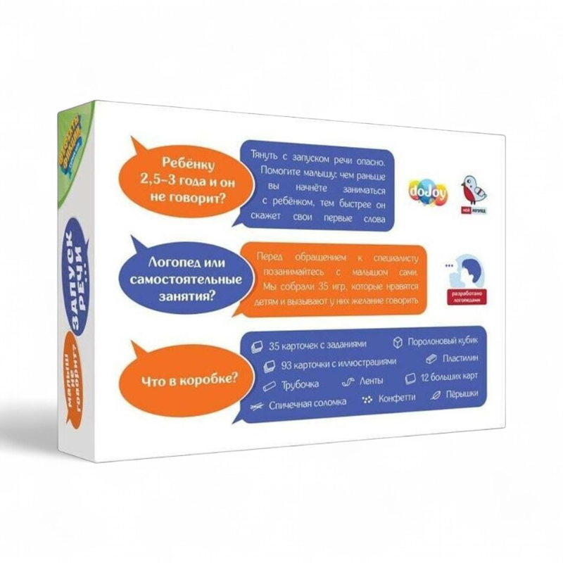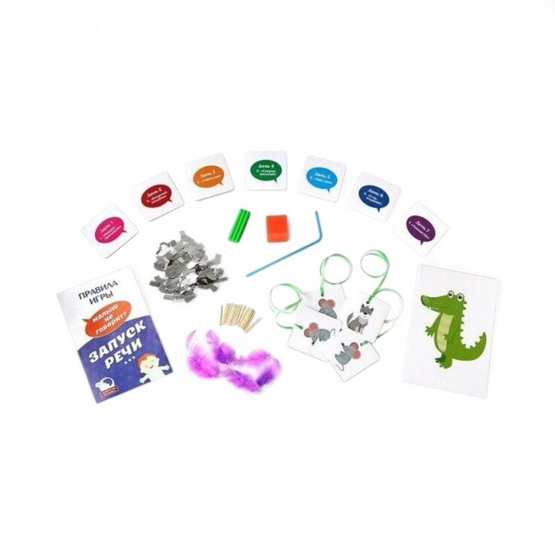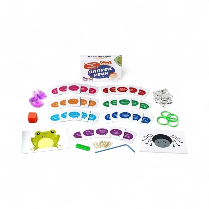 Быстрые и простые сессии. Правила осваиваются за минуту, одно занятие занимает 10–15 минут, играть можно вдвоем с взрослым — достаточно открыть карточку и следовать заданиям. Благодаря разнообразной комплектации ребенок подключает дыхание, артикуляцию, мелкую моторику и слух — те навыки, что лежат в основе запуска речи.