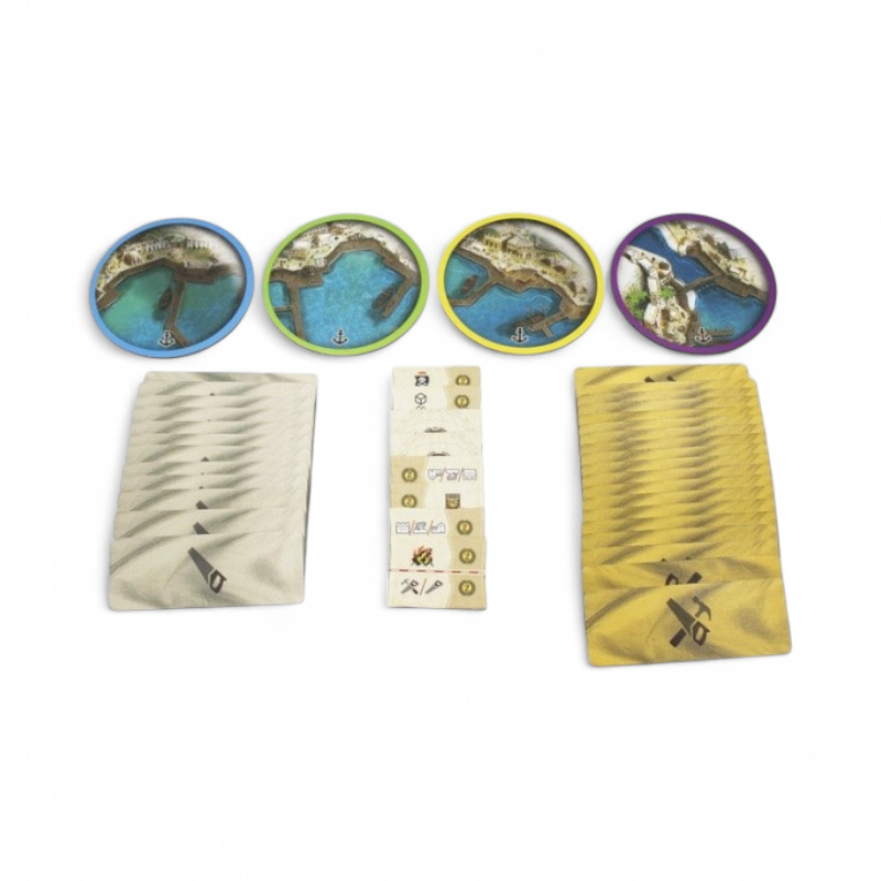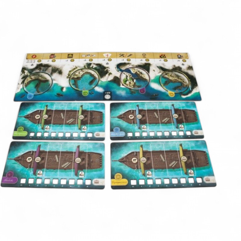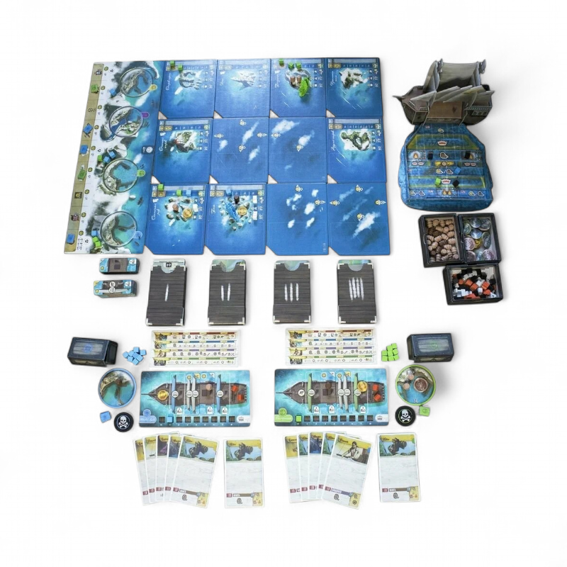Чем отличается от остальных: это самостоятельная базовая коробка с полноценной кампанией и свободным исследованием, к которой можно подключать допы для новых сюжетов и механик. В отличие от классических «корабельных» евро, здесь глубина построения движка колоды сочетается с динамичными морскими столкновениями и территориальным контролем — партия развивается по вашим решениям, а не по сценарию