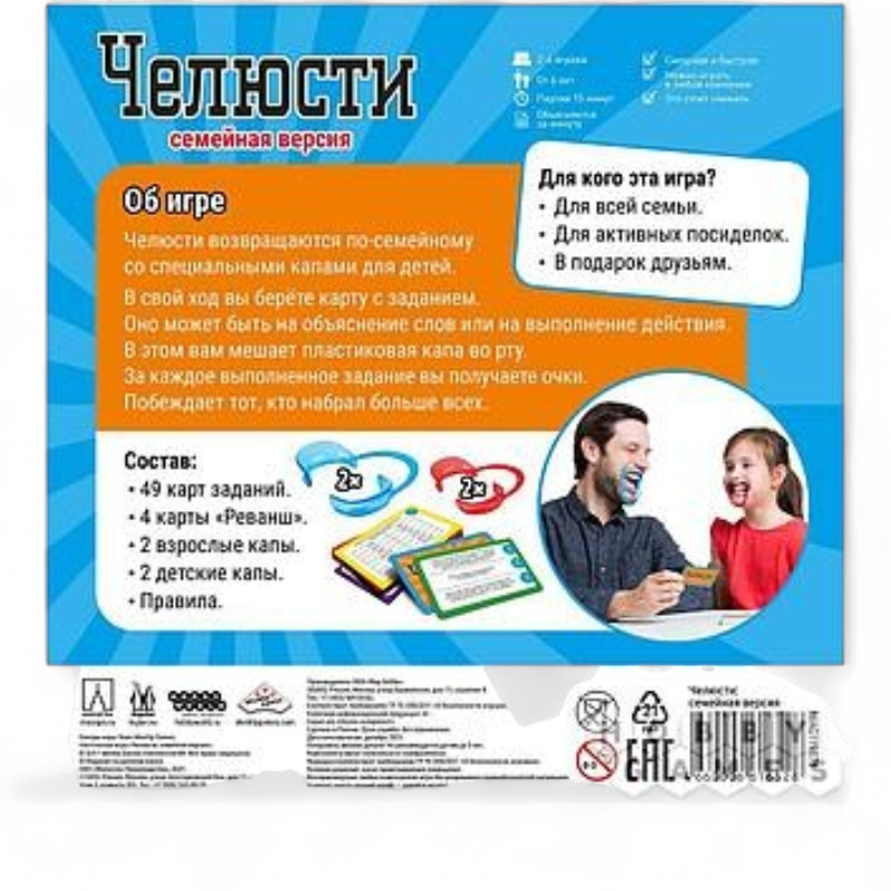 Семейное развлечение с капами: участники объясняют слова и выполняют действия, но во рту — специальные капы, из‑за которых говорить и даже шептать непросто. В семейной версии предусмотрены уменьшенные капы для детей, поэтому играть комфортно и взрослым, и младшим участникам. Партии быстрые и динамичные, оптимальны для 2–4 игроков и занимают около 10–20 минут.