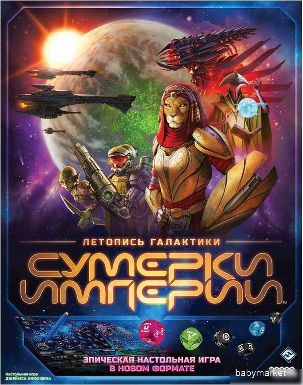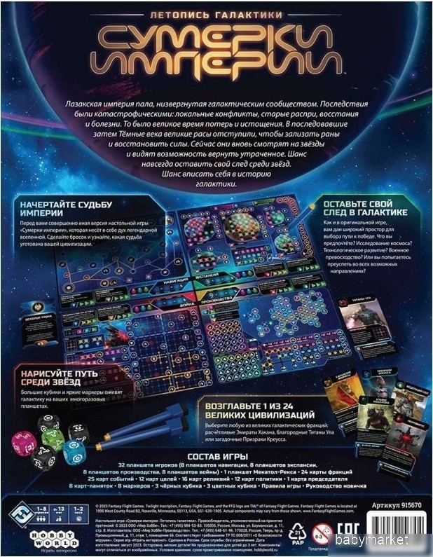 | Информация | - "Летопись галактики" - это уникальная версия настольной игры "Сумерки империи", которая открывает перед вами огромную вселенную. Выберите свой путь к победе: исследование космоса, технологическое развитие или военное превосходство. В игре представлено 24 цивилизации, каждая из которых может быть ведена к процветанию! - Как играть? Перед началом партии раздайте каждому игроку планшеты навигации, экспансии, производства и войны, а также по 3 карты фракции. Затем разложите планшет Мекатол-Рекса, карты политики и цели каждого типа. Вы готовы к игре! - Партия состоит из нескольких раундов, каждый из которых начинается с открытия карты события. Карты делятся на 4 типа: стратегические, военные, производственные и дипломатические. Выберите активный планшет и следуйте указаниям карты события, чтобы продвигаться к галактическому трону. - Развивайте планшеты, чтобы получать больше ресурсов, увеличивать боевую мощь, исследовать другие планеты и получать полезные активы. Старайтесь получить больше победных активов, чтобы увеличить свой итоговый счёт в конце игры. |