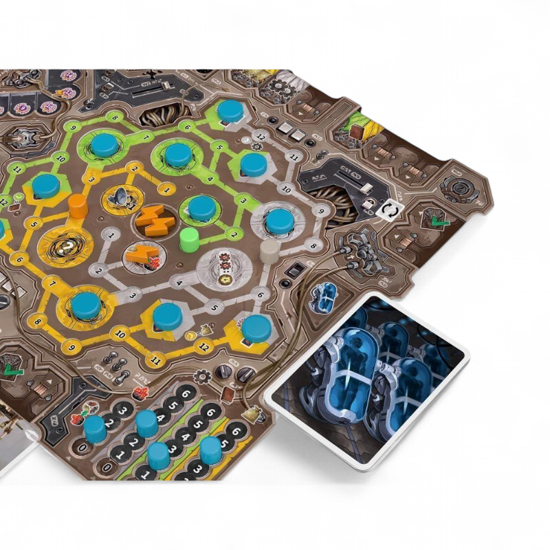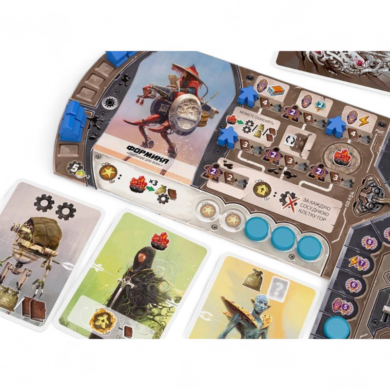 В коробке — крупное игровое поле, 25 тайлов местности и 5 стартовых, крупные локации, жетоны энергии, модулей, механизмов и контейнеров, а также набор артефактов; вес коробки почти 3 кг — это ощущается по количеству компонентов и толщине картона. Такое содержание поддерживает стратегическую глубину без перегруза правилами и обеспечивает четкую прогрессию от партии к партии.