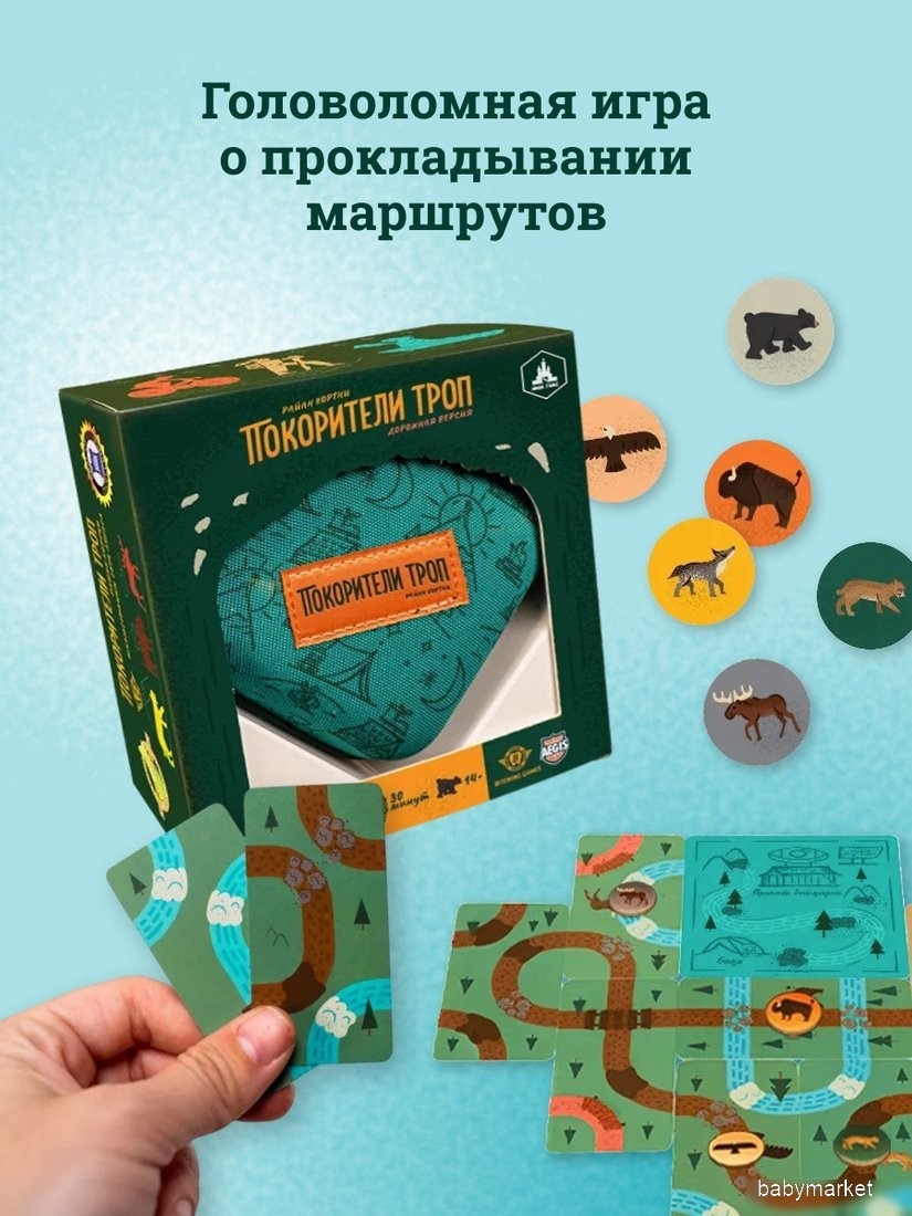 | Комплектация | 12 карт баз 12 карт целей 135 карт троп 16 карт игроков 1 памятка (соло-режим) По 10 жетонов медведя, орла, лося, бизона, волка, рыси |