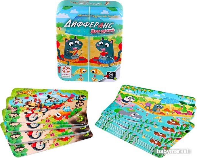 | Информация | Игра на наблюдательность, основанная на известном принципе «найди отличия». Перед каждым игроком находится колода карт с одной и той же картинкой. В начале игры одна карта с этой же картинкой помещается в центр стола в качестве главной. Все игроки одновременно пытаются найти два отличия между главной картой в центре стола и верхней картой своей колоды. Тот, кому удастся быстрее всех найти два отличи, кладёт свою верхнюю карту колоды поверх карты в центре стола – так появляется новая главная карта. Участник, быстрее всех избавившийся от своих карт, побеждает! |