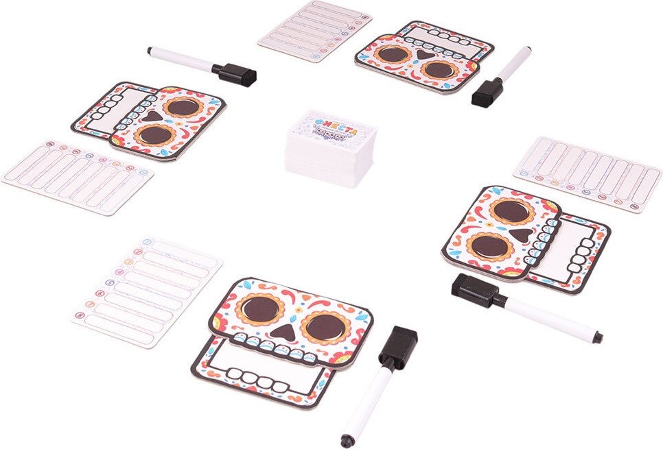 | Комплектация | планшеты черепа - 8 шт; планшеты для ответов - 8 шт; стираемые маркеры - 8 шт; карточки персонажей -120 шт; карточки с номерами - 8 шт; карточки ограничений - 12 шт; жетоны кости - 16 шт; пустые карточки персонажей - 10 шт; правила игры |