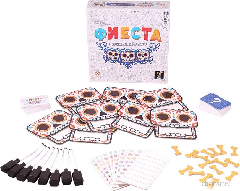 | Информация | - Добро пожаловать на карнавал...в честь Дня мёртвых! Традиционный мексиканский праздник вдохновил авторов на создание этой очень любопытной игры. - Фиеста. Карнавал мёртвых (Fiesta de los Muertos) – это новая кооперативная игра для большой компании. Цель игры – угадать как можно больше исторических личностей и известных персонажей, опираясь на подсказки-ассоциации, сделанные другими игроками. Игра объединяет в себе механики игр на воображение и игр, задействующих логическое мышление и дедукцию. Это идеальный вариант подарка на Хэллоуин и просто хорошее развлечение для любой вечеринки с друзьями. |