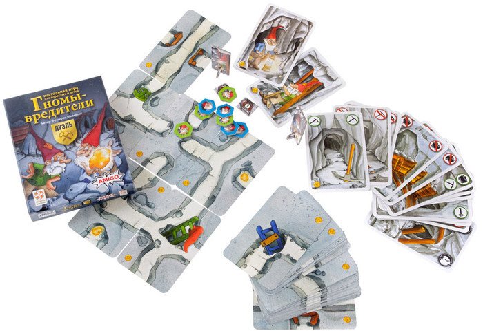 | Комплектация | 74 карты (2 двусторонние карты туннелей, 34 карты туннелей, 18 карт действий, 18 карт золотой жилы, 2 карты гномов), 8 двусторонних жетонов гномов, 2 жетона ключа, 2 фигурки гномов, правила игры. |