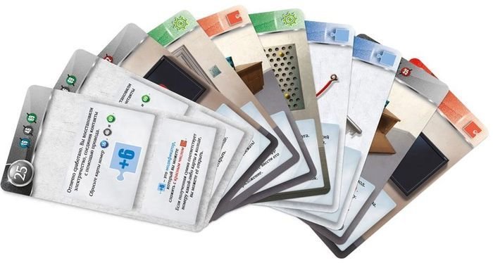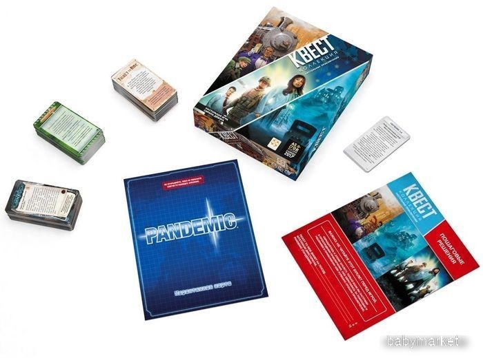 | Комплектация | Колода «Обучение» (10 карт); 3 приключения (180 карт, 1 карантинная карта, 6 красных кубиков и 1 буклет с решениями), правила игры. |