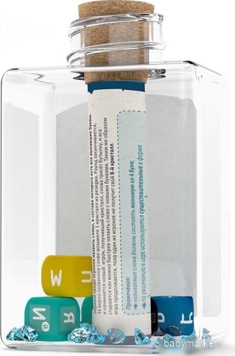 | Комплектация | 1 бутылка, 4 кубика с буквами, 1 кубик с эффектами, 45 кристаллов, правила игры |