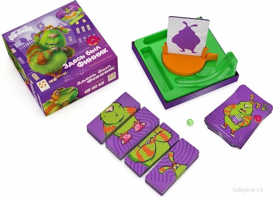 | Комплектация | 24 двухсторонних портрета Финника Карта-заслонка с силуэтом Финника 4 набора игрока по 16 карточек в каждом Вращающаяся платформа с горкой Шарик Правила игры |