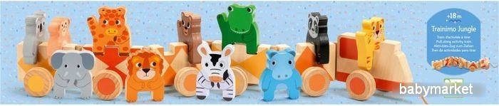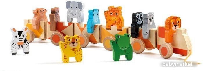 | Информация | Пирамидка-паровозик «Джунгли» — увлекательная развивающая игрушка от французского производителя Djeco, созданная из прочных, качественных и экологически чистых материалов. В состав игрового комплекта входят 11 деревянных персонажей, 1 деревянный поезд с 6-ю вагонами и 1 шнурок. Детям нужно собрать вагончики вместе и разместить в них забавных животных: льва, зебру, медведя, слона, тигра, бегемота, панду, крокодила, жирафа, коалу и обезьяну. В собранном виде игрушку можно использовать в качестве каталки. |